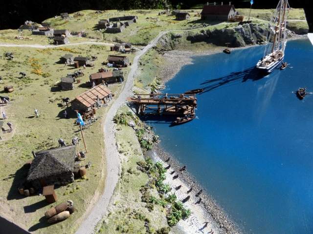 Maqueta histórica de Puerto Luís en Islas Malvinas. Museo Memorial Malvinas en Espacio Memoria (Ex ESMA) - C.A.B.A. Escala 1:100 - Dimensiones: 2,20m x 2,20m.
